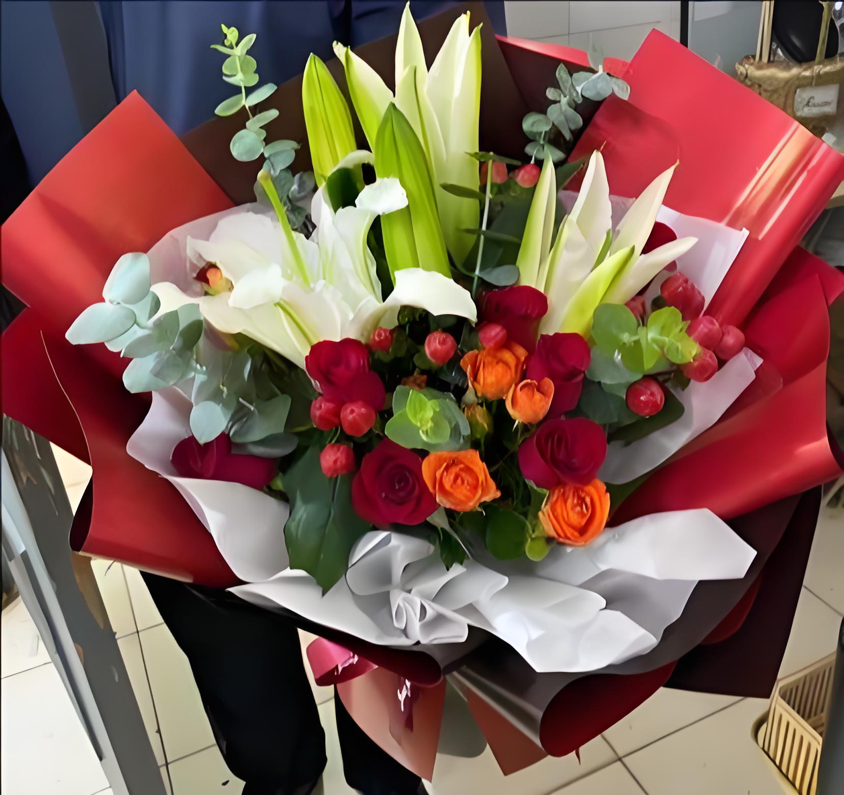 汕头金平区花店包11枝红玫瑰、2枝多头白百合、6枝橙色多头玫瑰、红豆、尤加利叶